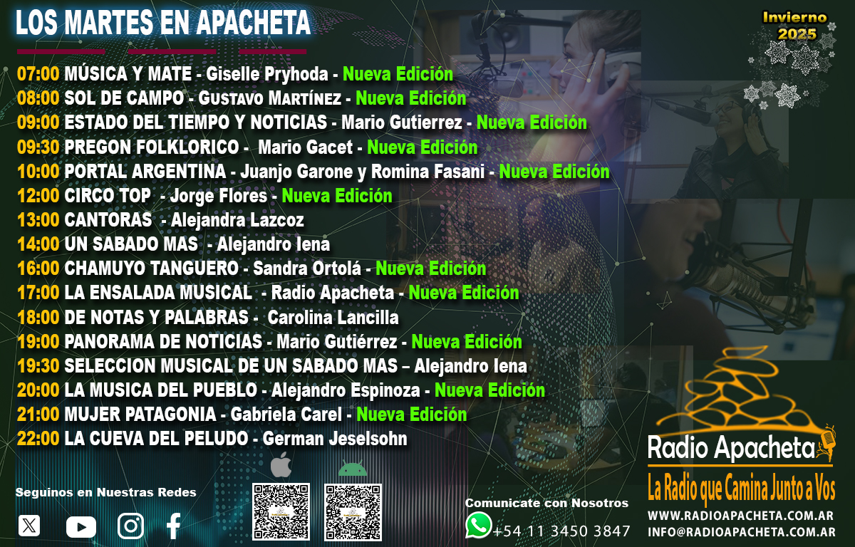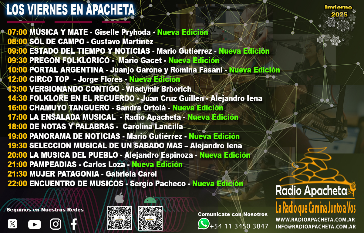 Cada día, gente apasionada por la radio difusión, te guiarán a través de una programación variada que incluye conciertos en vivo, entrevistas con artistas, y programas temáticos que exploran la evolución de la música argentina. Ya sea que estés buscando revivir clásicos inolvidables o descubrir nuevos talentos, Radio APACHETA es tu ventana al mundo musical de Argentina.